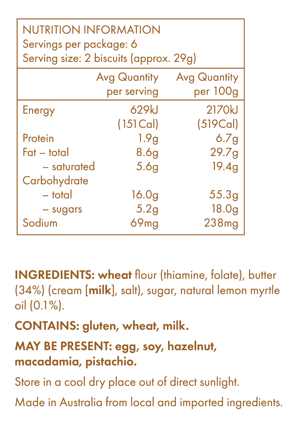 Deliciously smooth, pure butter shortbread, blended with Australian native lemon myrtle. Crafted in the Yarra Valley region of Victoria.