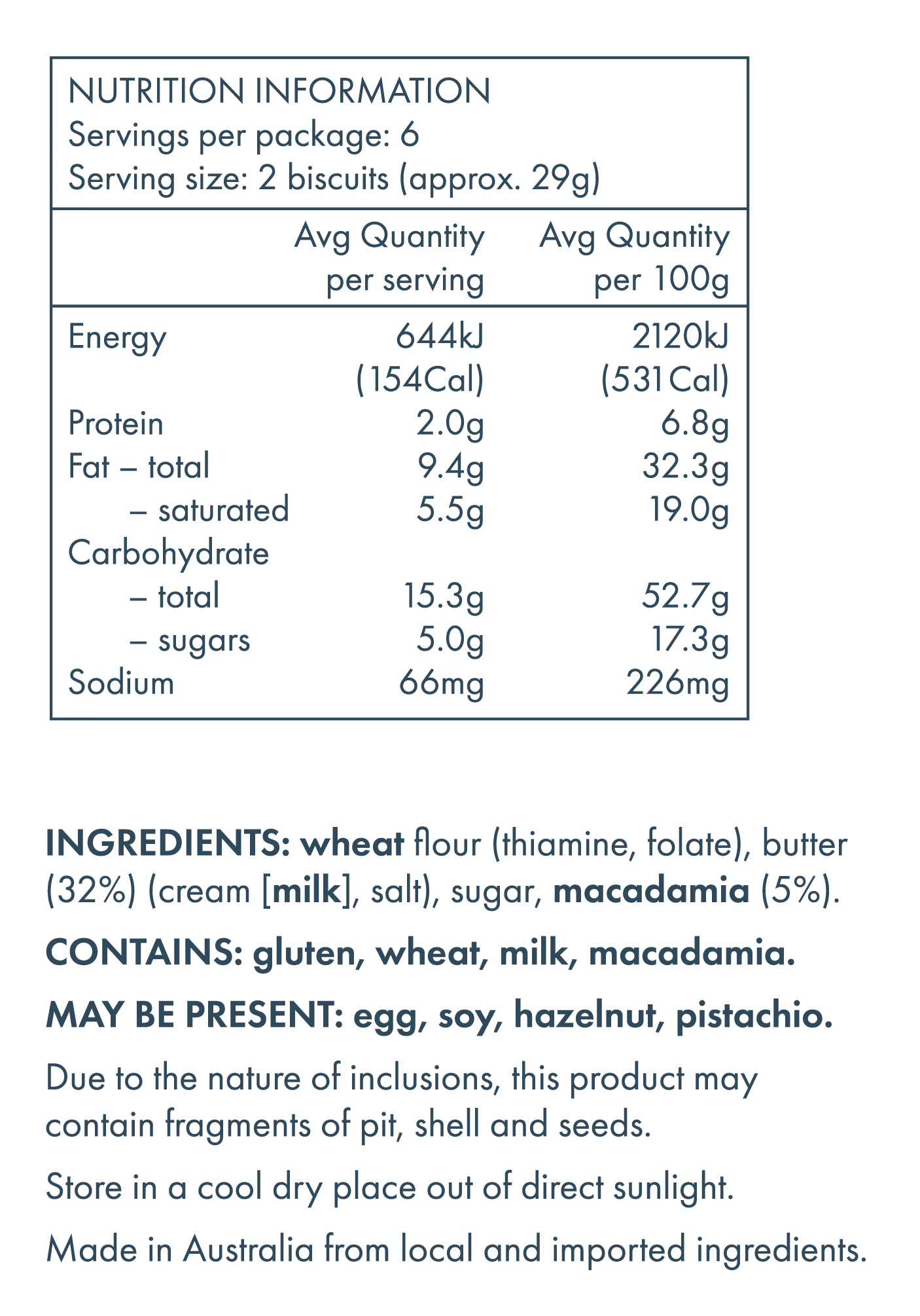 Deliciously smooth, pure butter shortbread, blended with Australian macadamia nuts throughout. Crafted in the Yarra Valley region of Victoria.