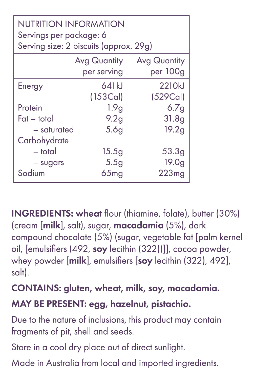 Deliciously smooth, pure butter shortbread, blended with Australian macadamia nuts and creamy choc chips throughout. Crafted in the Yarra Valley region of Victoria.