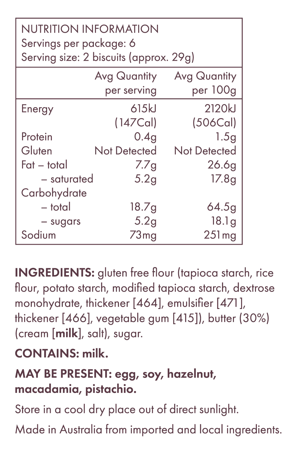 Deliciously smooth, gluten free, pure butter shortbread. Crafted in the Yarra Valley region of Victoria.