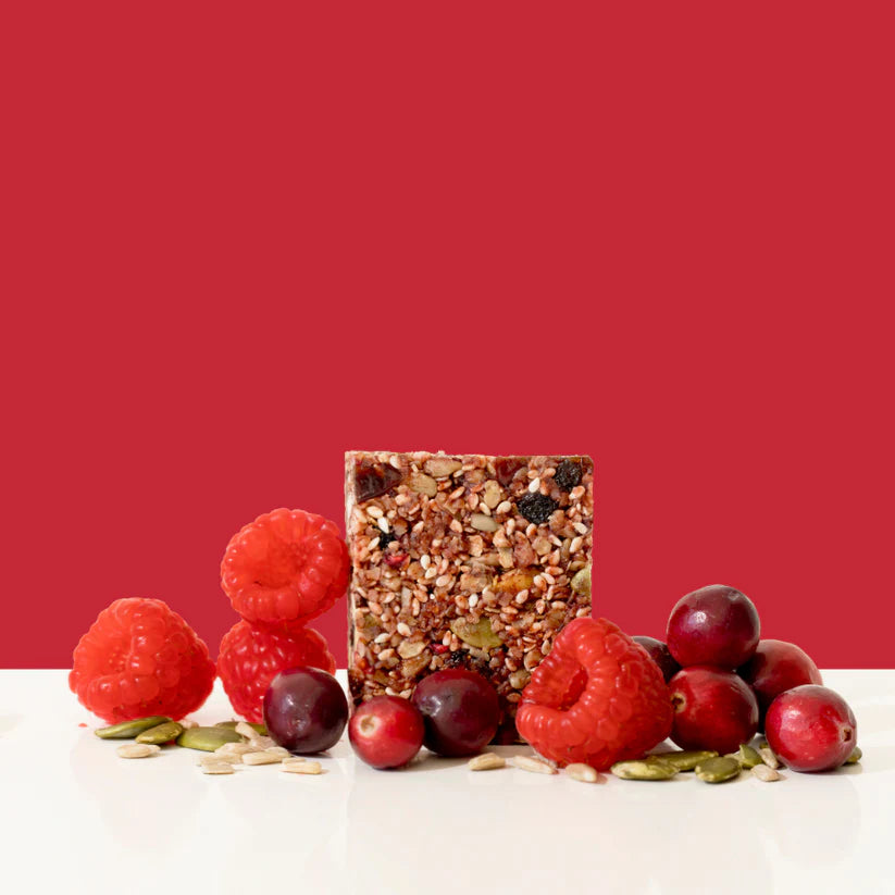 Ingredients: Oats, Sesame Seeds, Coconut Sugar, Cranberries (11%) (cranberries, apple juice concentrate, sunflower oil), Manuka Blend Honey, Pumpkin Seeds, Sunflower Seeds, Currants, Sunflower Oil, Dehydrated Raspberries (1%), Dehydrated Beetroot (1%)